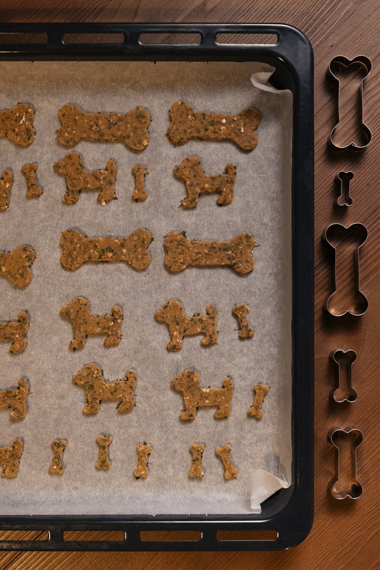 Tento recept vyžaduje pouze šest surovin. Easy! Aby bylo pečení i následné psí odměňování ještě veselejší, využijte pro vykrajování naše vykrajovátko ve tvaru kosti. Z jedné várky tak vznikne 20–30 kousků (podle velikosti).